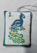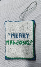 "A celebration of craftsmanship and whimsy, this hand-beaded treasure showcases the iconic One Bamboo tile in radiant detail. Flip it over to reveal a festive “Merry Mahjong”—a wink to game nights and holiday cheer.
