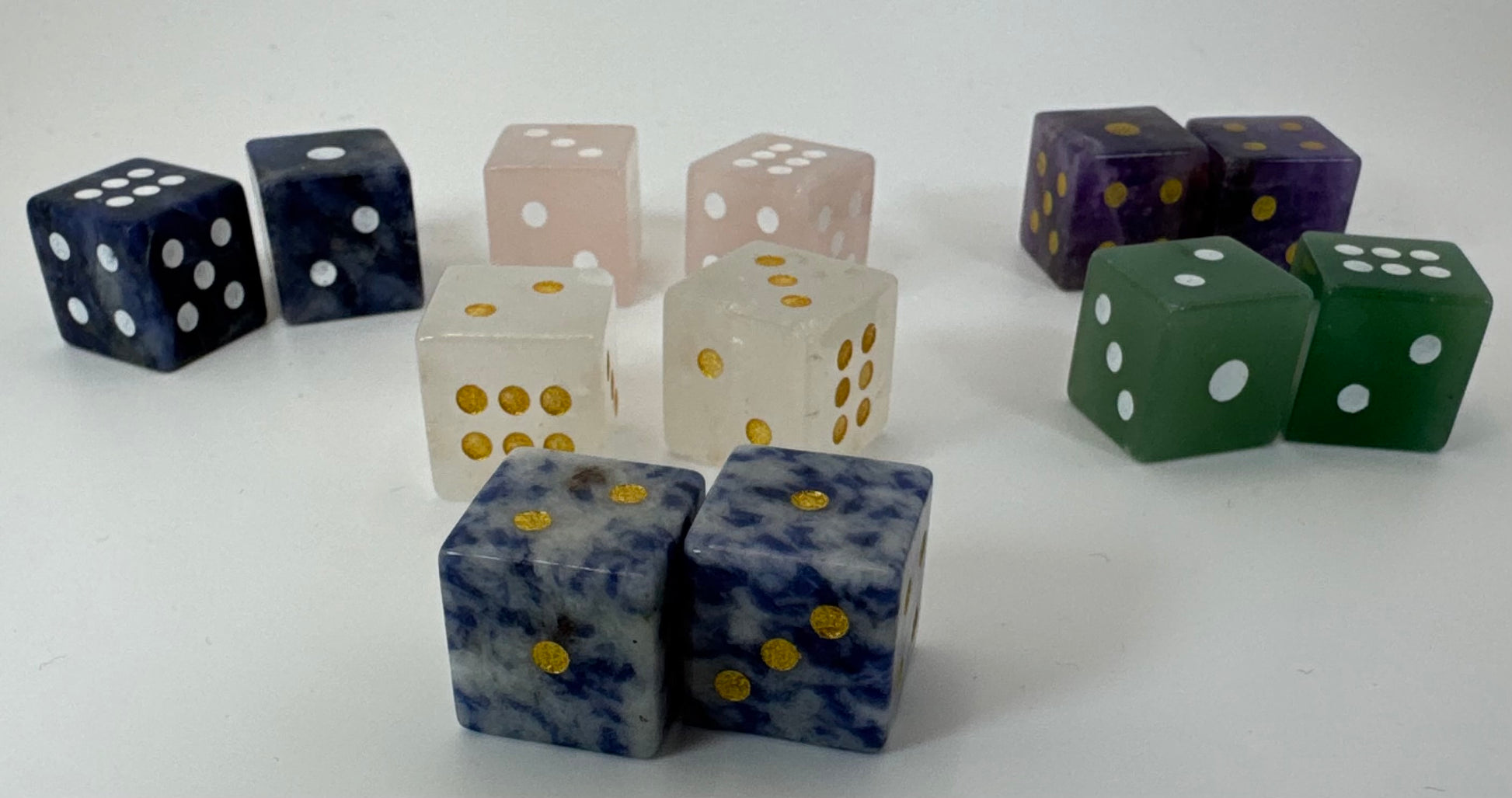 Roll with style! Upgrade your game night with the timeless elegance of our Bougie Dice! Crafted from natural semi-precious stone, each set boasts unique variations in color and pattern—making every roll as beautiful as it is exciting.